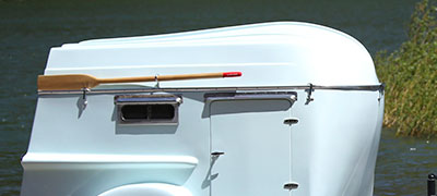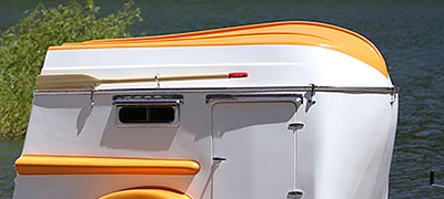 The trailer sleeps two and includes a cooking and storage galley in the rear. A secondary roof keeps your gear dry while you're rowing across the lake. Five hood latches secure your boat while on the road.